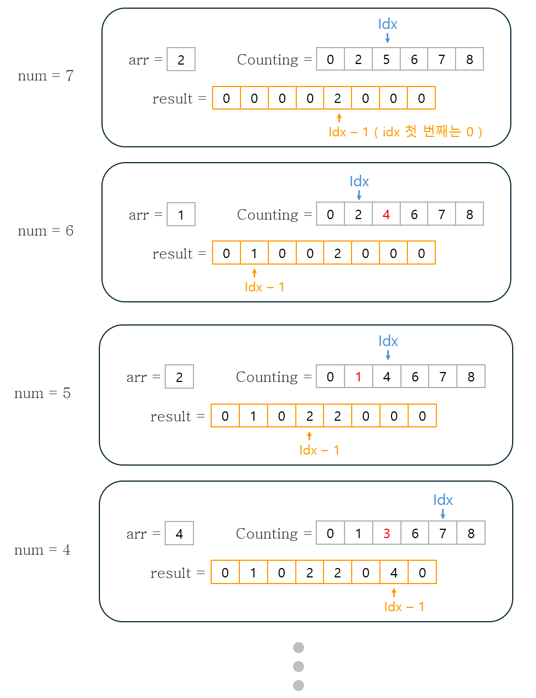 - Counting에서 arr의 데이터 인덱스를 찾아 result에 바로 대입합니다.